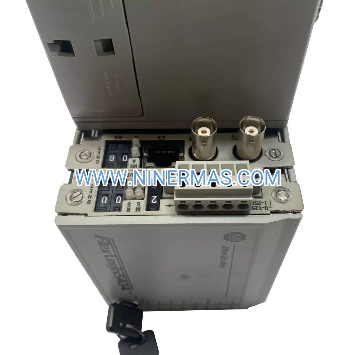 The controller supports up to 32 local FLEX I/O modules with a maximum of 4096 digital I/O points. For applications requiring additional capacity, use Ethernet/IP remote I/O adapters (1794-AENT) to add distributed FLEX chassis, extending total system capacity to 128,000 I/O points across multiple network segments.