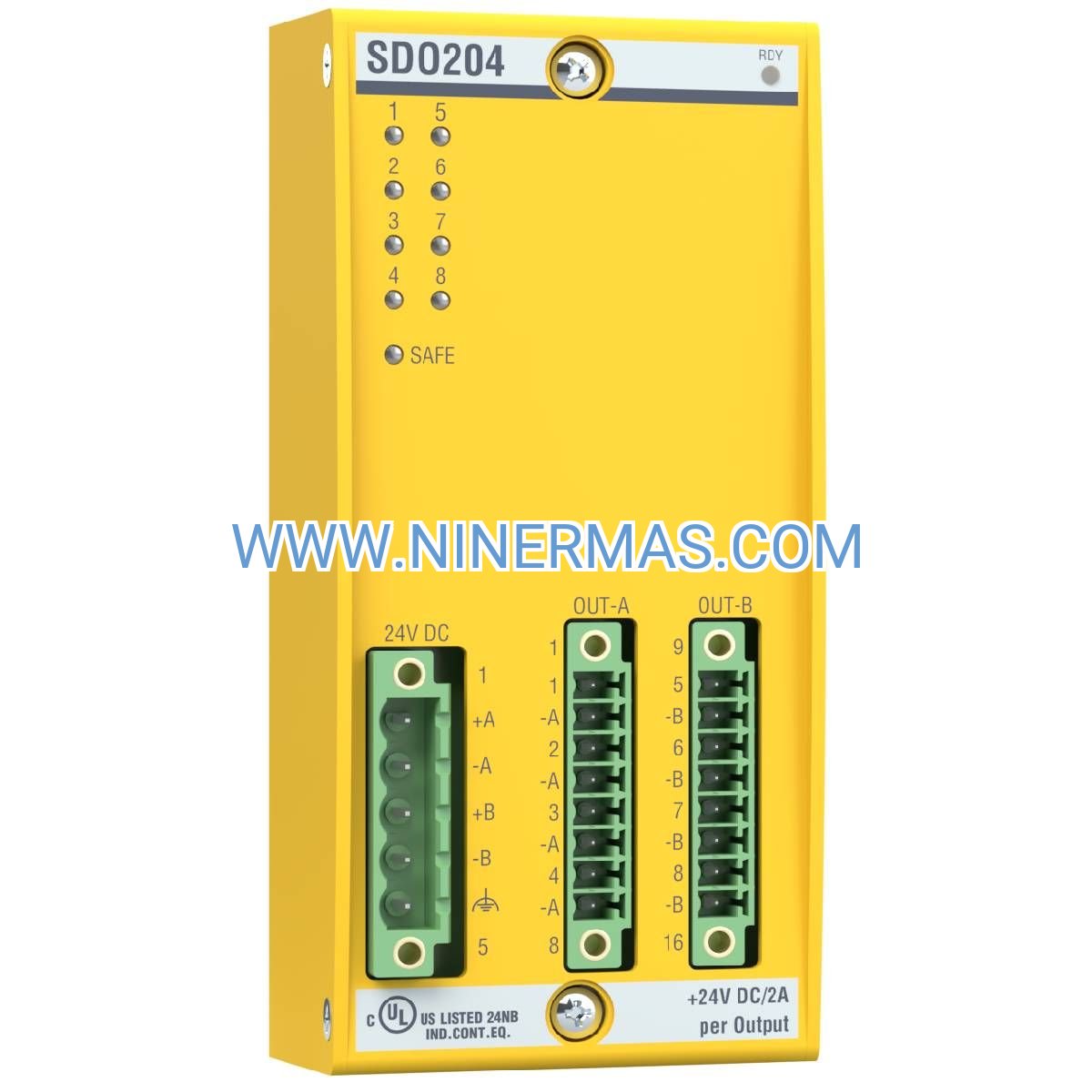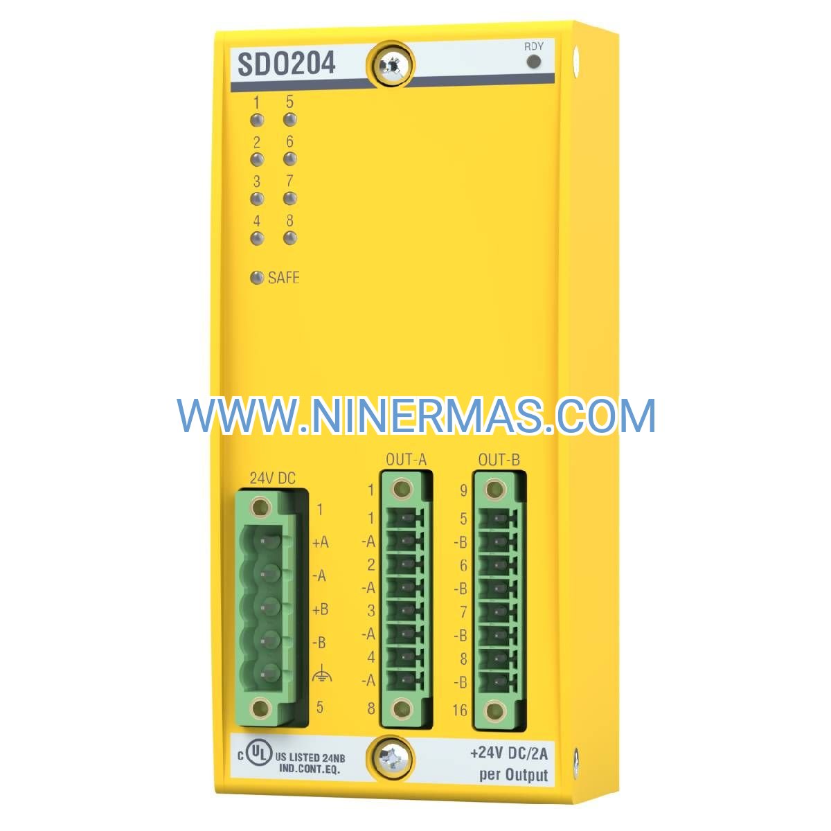 Selection Criteria: Choose the SDO204 when your application requires SIL3/PL e certified outputs for controlling safety relays, contactors, or solenoid valves rated ≤2A per channel. For higher current loads, use external safety relays with appropriate contact ratings. Verify that your safety controller supports the required number of safety output pairs in your safety function logic.