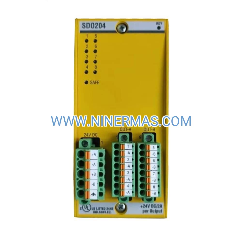 The SDO204 is a hardware-only module with no user programming. Safety logic resides in the safety controller (SLC284). Replacement modules are plug-compatible, though safety validation procedures require functional testing after installation per IEC 61508 requirements.